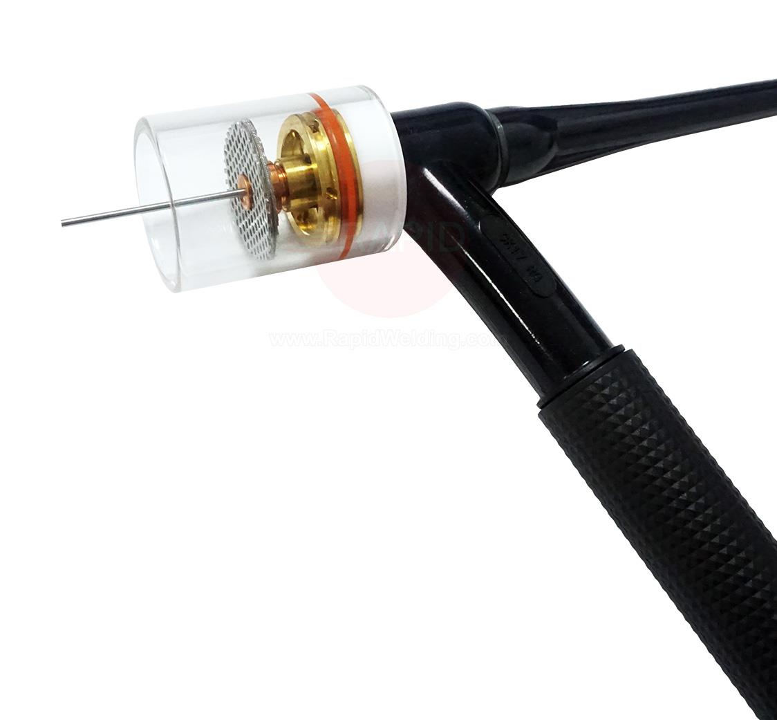 This design is lightweight, allowing for operator comfort and accurate control. The front end also uses a clear Pyrex cup creating excellent visibility of the weld puddle. The clear cup features an inside diameter of 1 1/8" (28.57mm) which is the largest cup orifice available on the market today.