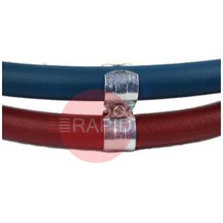 An impact resistant metal clamp, secured with a central screw, designed to hold two lengths of hose up to 10mm diameter, as a legal alternative to taping.
