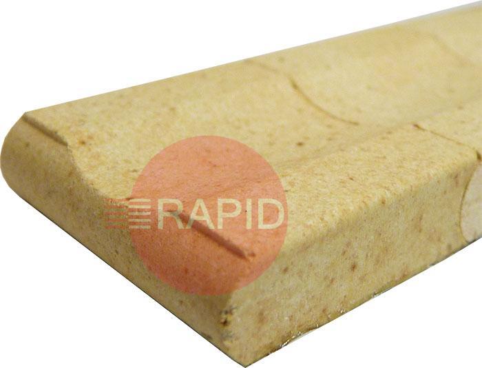 This tile is larger and has a larger groove than the 1G42 tile or the 1G41-R tile where the user needs more penetration and more substance in the tile. Possibly for submerged arc welding applications and thicker plates. Each tile is radiused to form a strip around the cylinder.