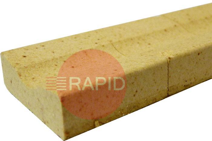 This tile has upturned sides for use when the plates are introduced at an angle or with differing thicknesses to allow the root of the weldment to sit snugly against the tile and present next to the radiused portion where the root will form.