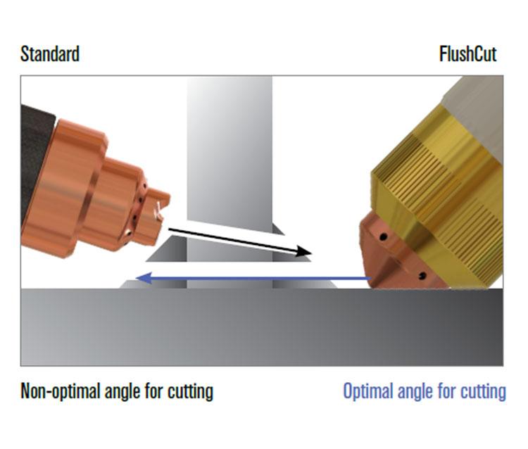 Patented FlushCut™ consumables have been specifically designed to allow Powermax users to cut attachments, lugs, pad eyes and other positive features as close to the base as possible without piercing or damaging the workpiece. An angled nozzle bore design and flat guiding shield enables flush cutting that leaves less than 5mm (3/16”) residual material on the base or work piece, reducing grinding and secondary repair operations.