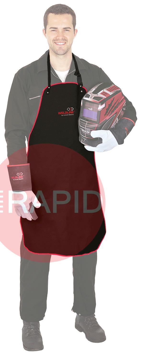 The Weldline Split Leather Apron is designed to protect the clothes of the welder from welding spatters and grinding particles. This apron is fixed with a cotton strap which releases clips to the waist and flap, with eyelets and fabric laces, fastening with rapid connection, sewn finish with a red fabric border and is a single size only. Dimensions 900 x 600mm.
