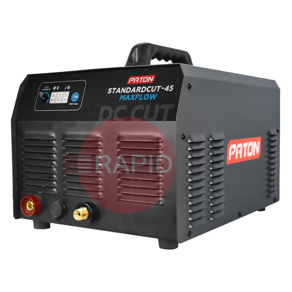 The Paton StandardCUT-45 MAXflow inverter plasma cutter is designed for manual plasma arc cutting of metals and alloys in an air stream enabling high precision cuts in metals of different textures and thicknesses up to 10mm. The cutting machine in the ‘Standard’ series is powered by a single-phase 230V power supply and combines high power with ease of use and small dimensions. This machine is suitable for use in both private and professional workshops.