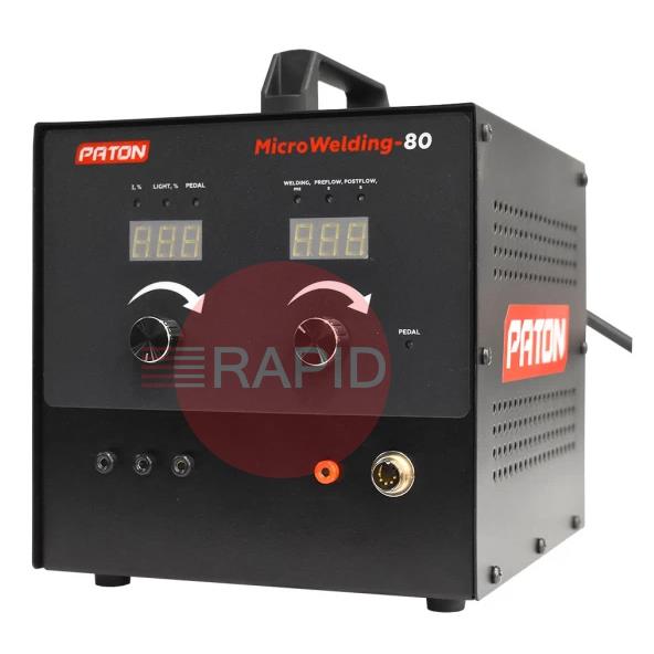 PATON MICROWELDING-80 is designed for pulse-arc welding with a tungsten electrode in an argon protective gas environment. The machine has a nominal current of 210A with the ability to adjust the pulse duration from 0.1 to 30 milliseconds. It also features adjustable pre- and post-gas flow time.