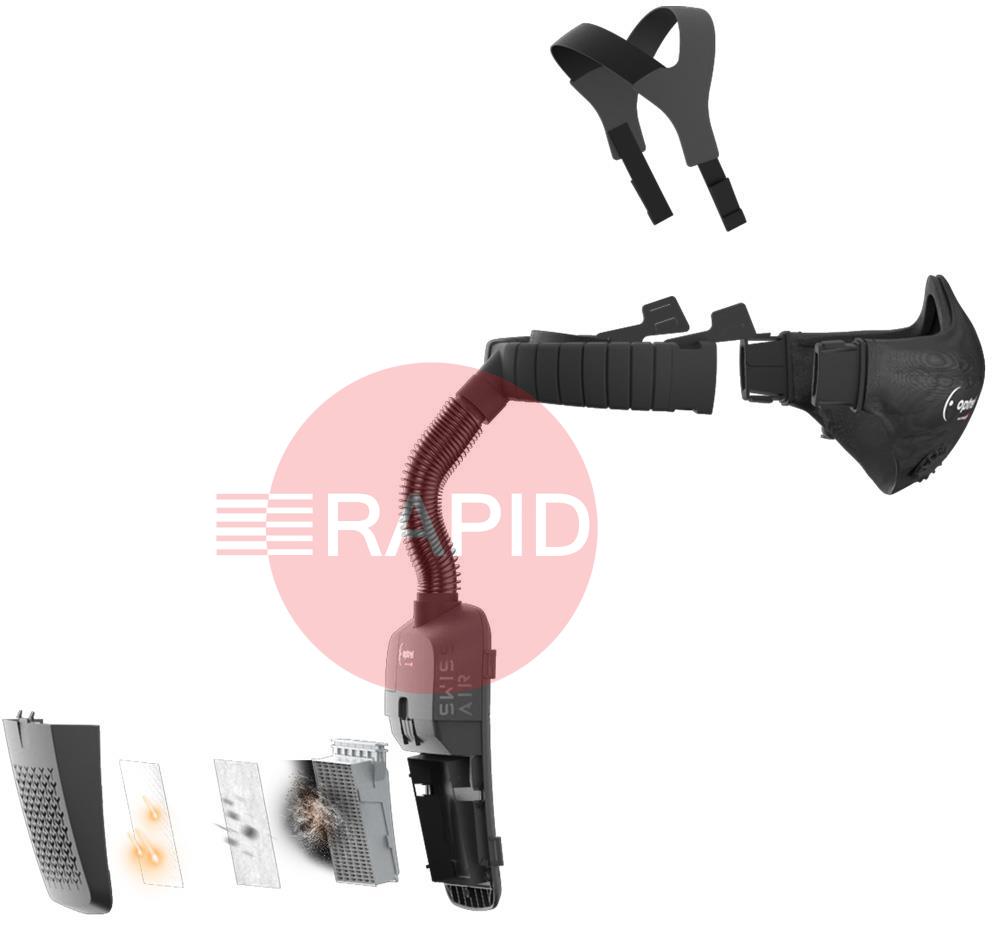This ready-to-grind package includes the Clearmaxx helmet, and the Swiss Air respiratory protection system complete with a control panel with a comfort half mask: consisting of a half mask and hose system. Also included is a head and neck strap, blower unit, 14-hour battery, battery charger (UK, EU, US and AUS adaptors), shoulder harness and storage bag.
