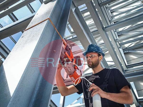1 cordless magnetic core drill, 1 coolant pump, 1 lashing strap, 1 swarf hook, 1 centring pin 100mm, 1 contact guard, 1 drift key and 1 case.