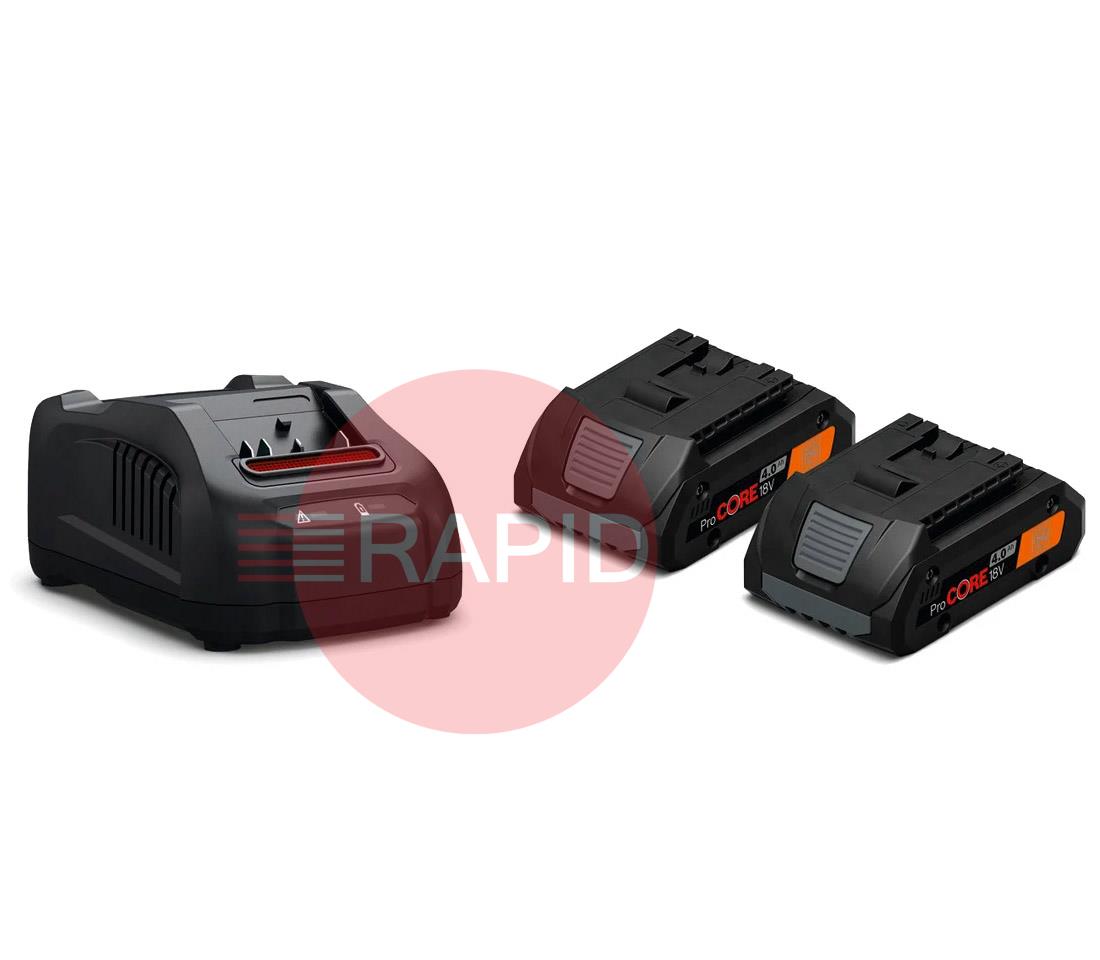 Two ProCORE Li-Ion batteries with high-power cells with GAL 1880 CV rapid charger. Short charge times thanks to the high charge current of 4A, active air cooling and process-controlled charge management. User-friendly and space-saving thanks to fixtures for coiling the mains cable. For all battery packs with AMPShare or Bosch Professional 18V battery interface. Charge times (80% of max. capacity): GBA 18V 4.0Ah: 25min.