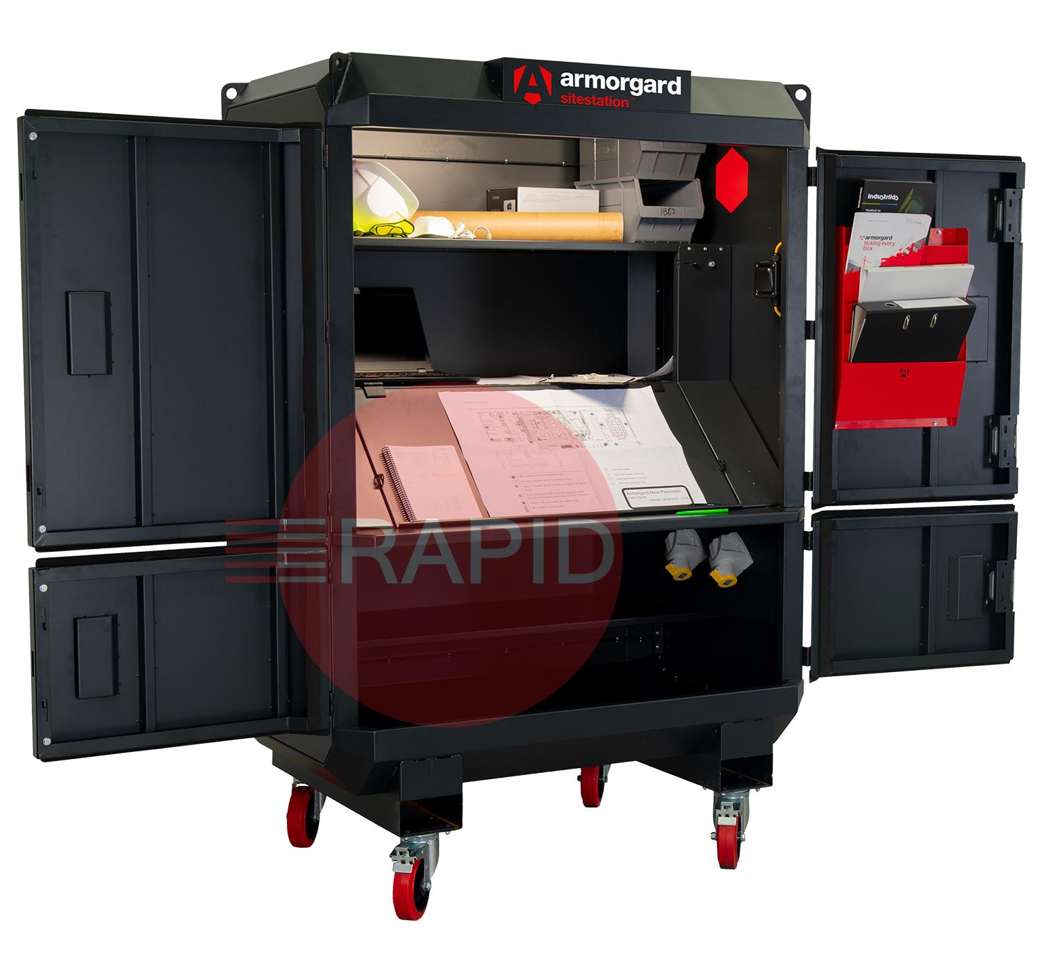 Sitestation 1355mm x835mm x 2000mm. Complete Work Station, designed to use on-site as a workstation for securing everything from PPE to fixings and power tools. An extra secure area inside the upper compartment allows the unit to be left open whilst securing any valuables.