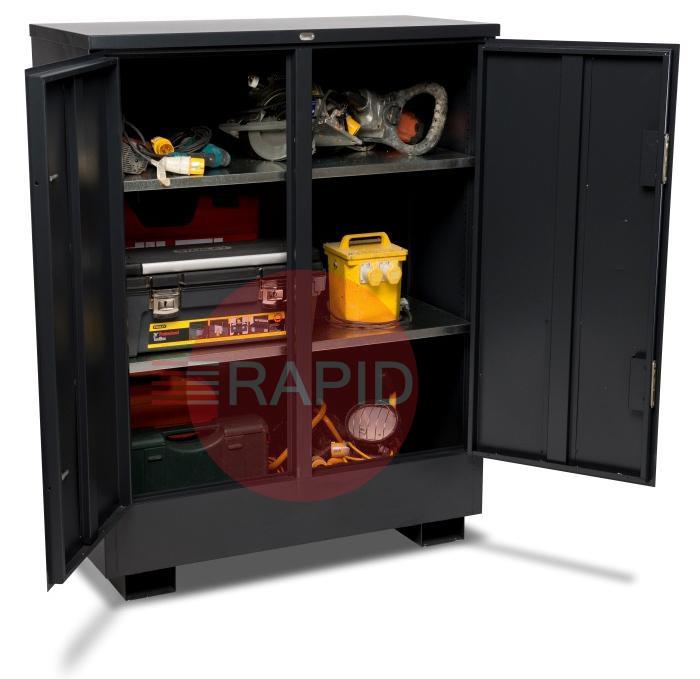 Tuffstor Secure Cabinet 1205mm x 580mm x 1555mm. Cabinet-style security boxes with adjustable shelving. Designed to keep tools, equipment and fixings more organised and accessible. Also ideal for inside a vehicle where they occupy less floor space than traditional security boxes.