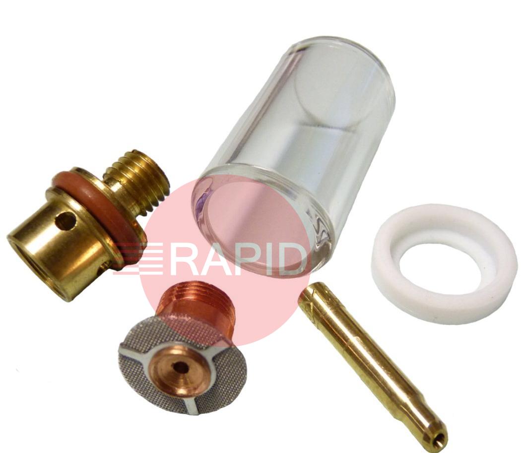 Alumina push-on or Pyrex high-temperature glass cups are available. Alumina cups are durable, impact-resistant and handle high-temperature welding applications. Pyrex glass cups are used in applications where visibility is an issue such as inside corners, inside pipe, around tubing, etc.