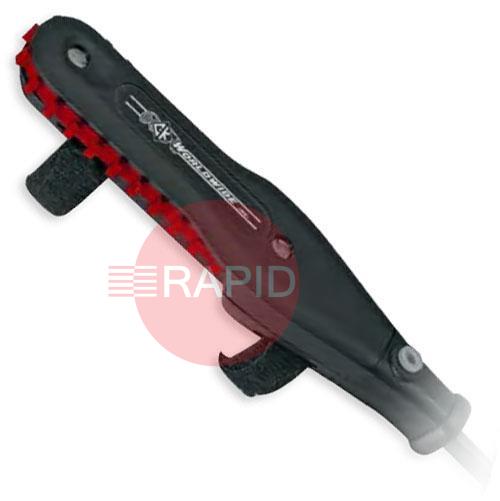 CK Remote amperage controls provide welding machine contactor on-off, activate gas and/or water solenoids, and provide full range current output control. The fitted Velcro straps are a one size fits all solution that can be easily retrofitted to all torch handle diameters. A built in strain-relief prevents the control cord from being pulled out or damaged.