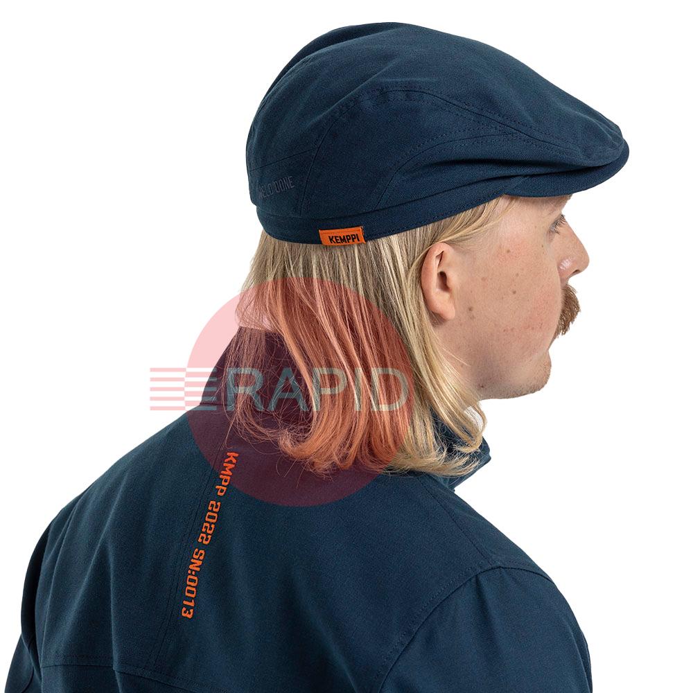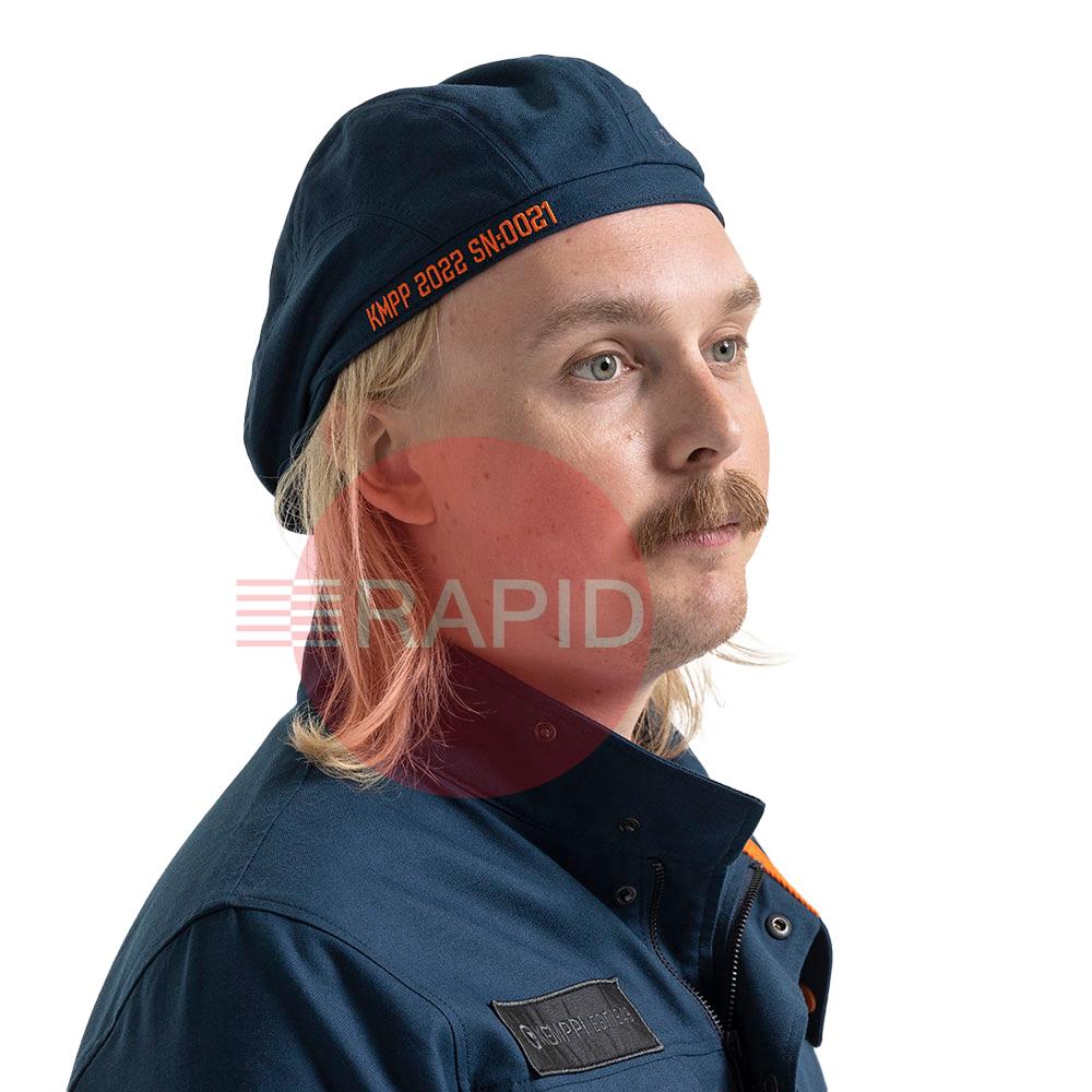Kemppi Wear model 0021. A classic peaked cap inspired by the timeless iconic look. Designed to fit both male and female. Made from canvas woven material. Looks good no matter if you have the peak forward or backwards. Made from flame retardant fabric of 55% modacrylic, 33% cotton, 10% polyamide and 2% antistat. Black with orange detailing and Navy blue with orange detailing. Not certified to welding standards.