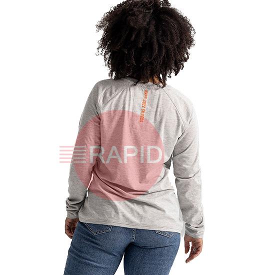 Kemppi Wear model 0022. A high quality, classic long-sleeved round neck T-shirt for women. Inspired by casual leisurewear and the demanding world of welding. Comfortable raglan sleeves. Soft, yet durable jersey knit material made from flame-retardant fabric with 55% modacrylic, 33% cotton, 10% polyamide and 2% antistatic agent. Available in black with grey print and grey two-tone blend with grey print. Not certified to welding standards.