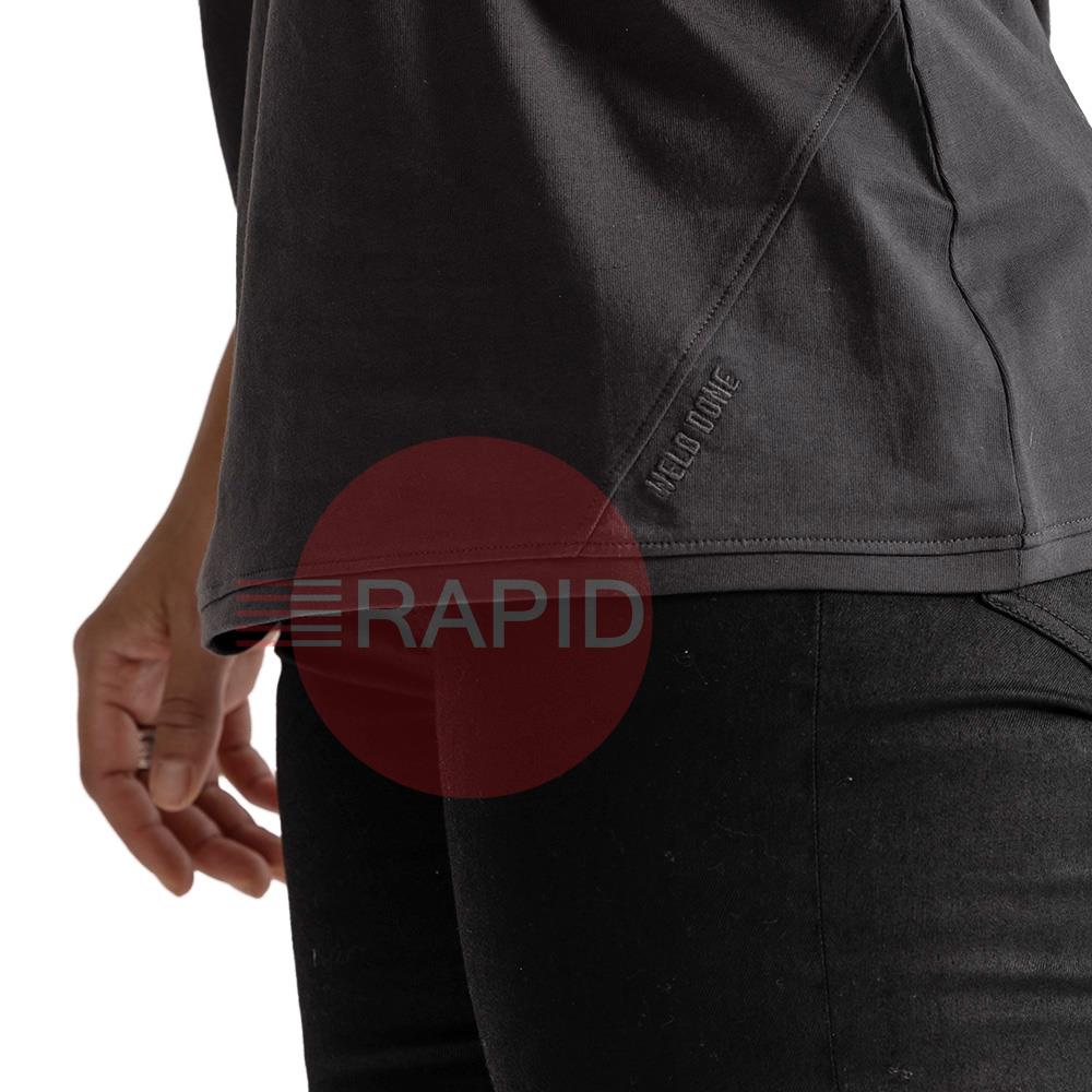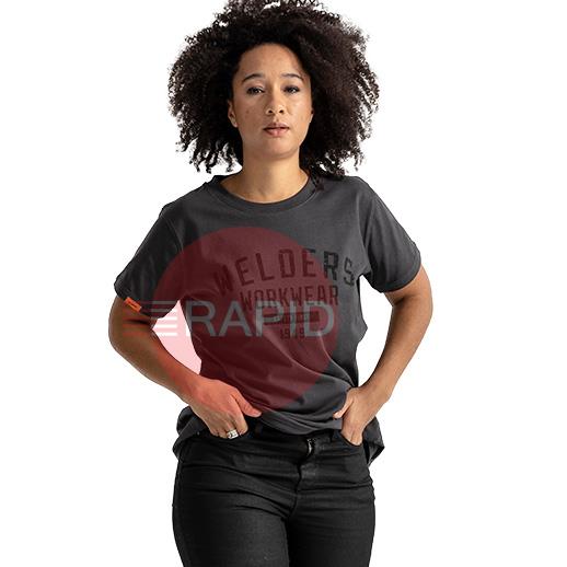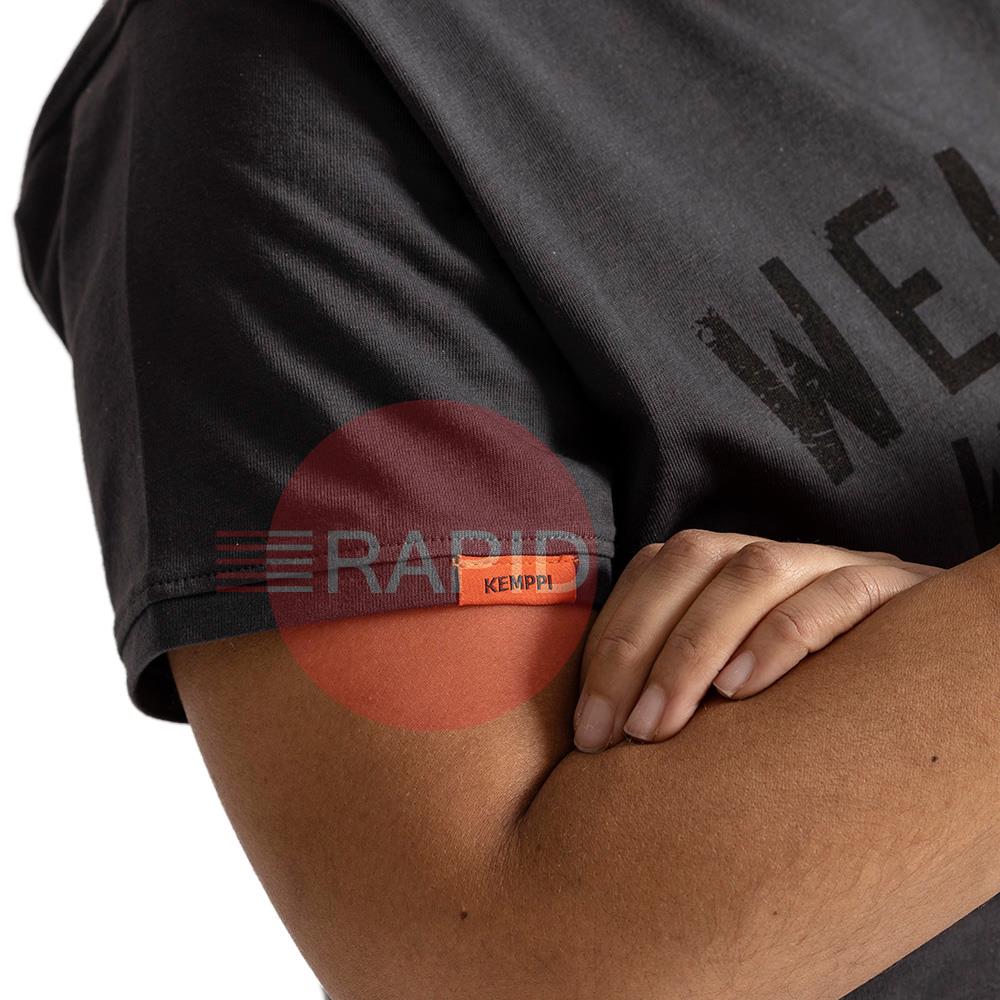 Kemppi Wear model 0023. A high quality, classic round neck T-shirt for women. Regular fit. Very comfortable with a soft, yet durable jersey knit material made from flame-retardant fabric with 55% modacrylic, 33% cotton, 10% polyamide and 2% antistatic agent. Dark grey with black print. Not certified to welding standards.