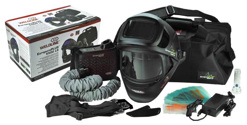**Consists of the Europure PLUS welding helmet, auto darkening lens with shades 8-13 and PAPR system. Also included are five front cover lenses, two inner cover lenses, one side lens cover, a pre-filter, a filter, a lithium battery, a spark screen, a 100-240VAC battery charger, a hose with cover, a padded belt, head covering, shoulder straps, an airflow indicator and duffle bag.**