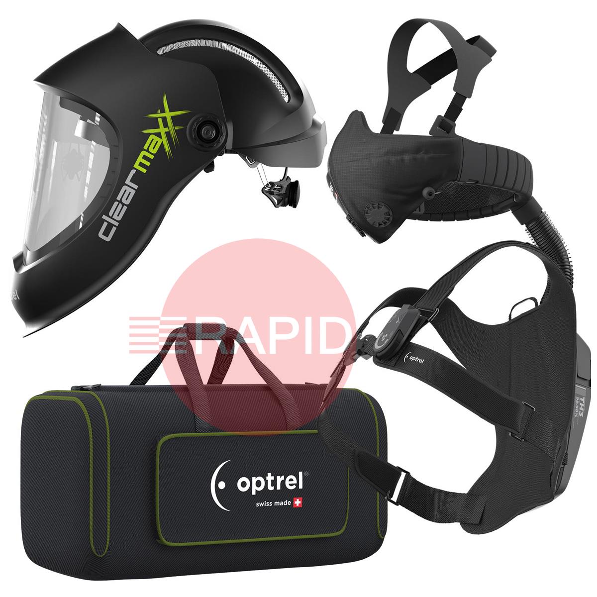 This ready-to-grind package includes the Clearmaxx helmet, and the Swiss Air respiratory protection system complete with a control panel with a comfort half mask: consisting of a half mask and hose system. Also included is a head and neck strap, blower unit, 14-hour battery, battery charger (UK, EU, US and AUS adaptors), shoulder harness and storage bag.